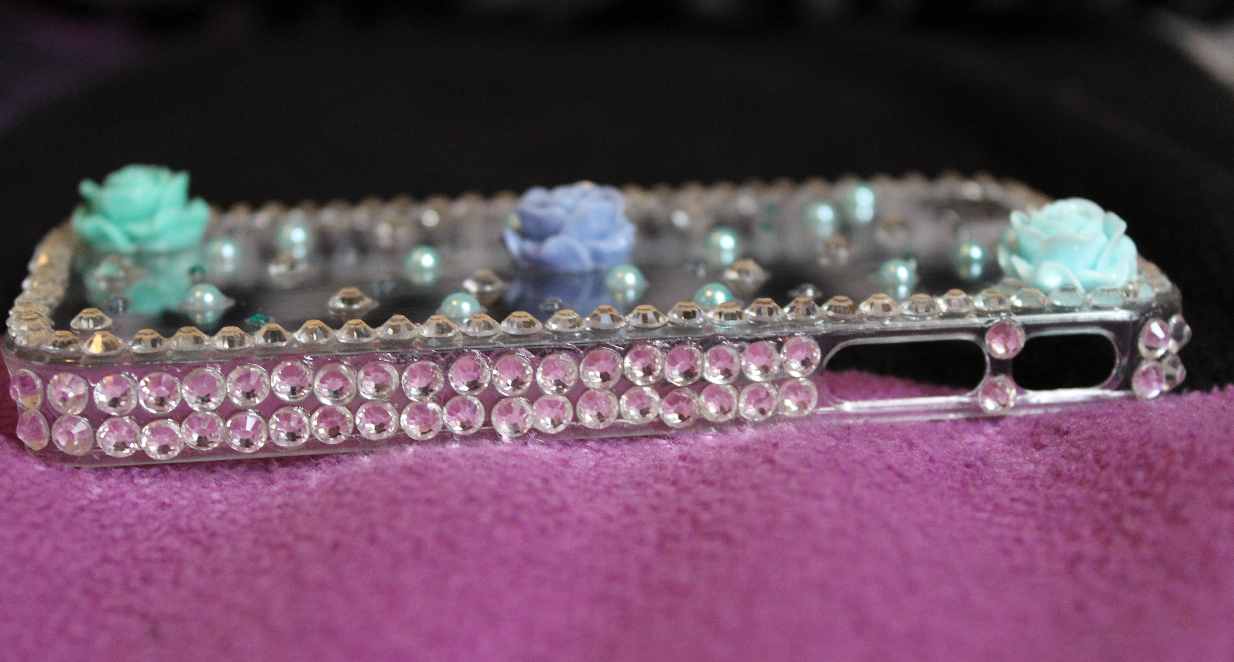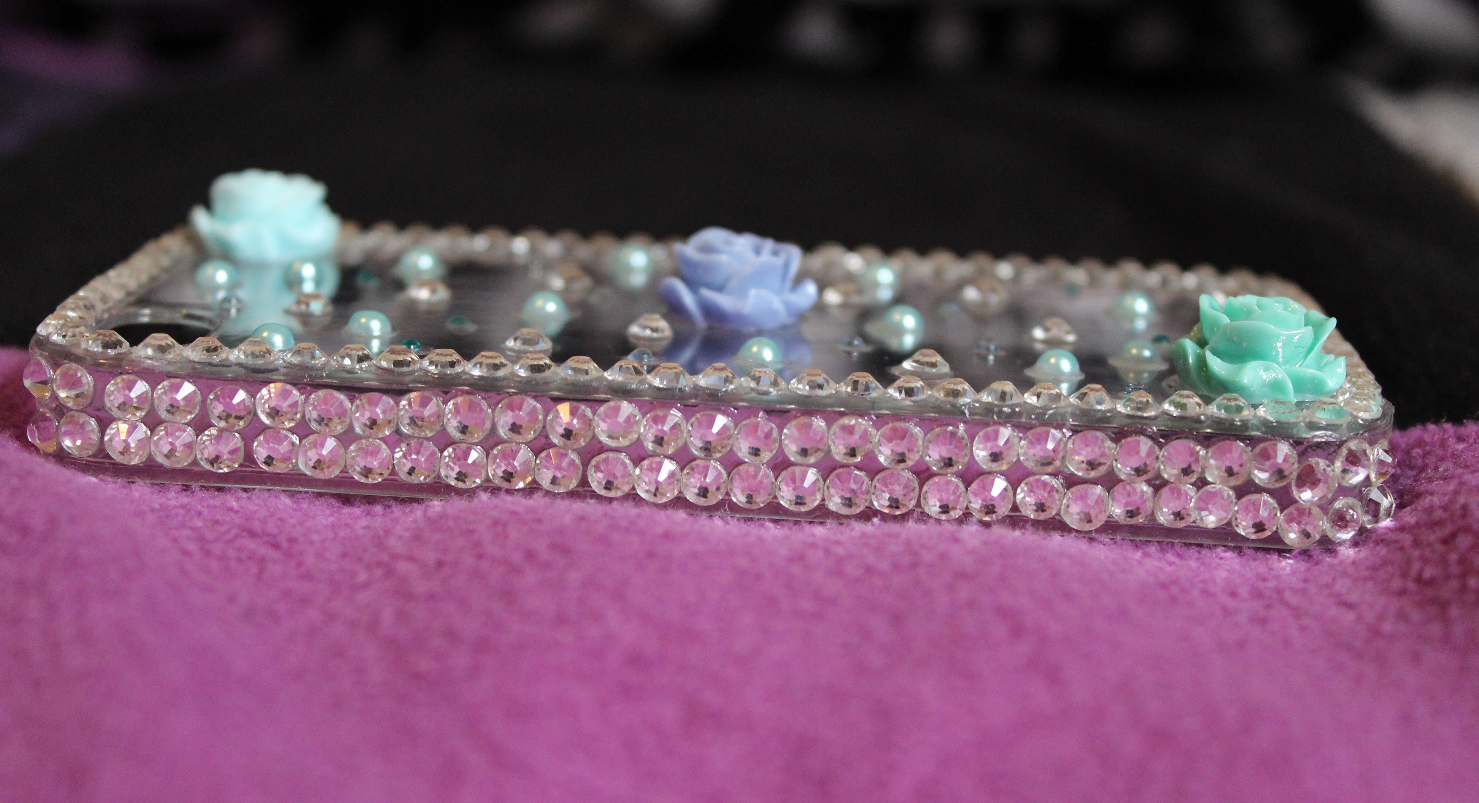 This hand made case features 3 flowers and crystals around the case and on the sides. It also has pearls and crystals on the back of the case.